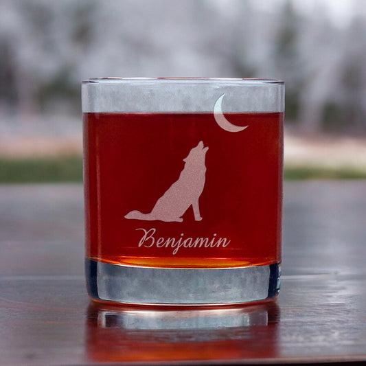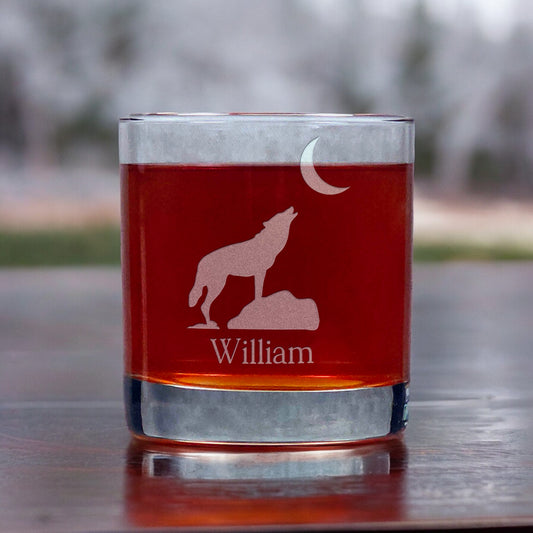 Wolf Howling at Moon Engraved 11oz Whiskey Glass - Design 1 - Personalized Wolf Rocks Glass