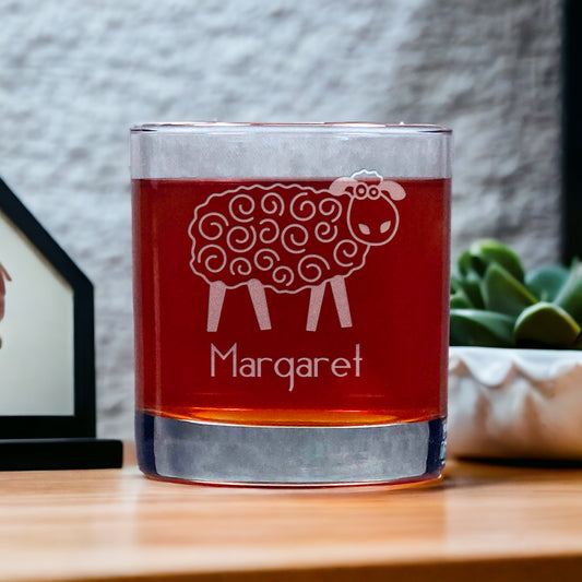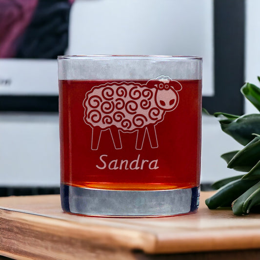 Sheep Cartoon 11oz Whiskey Glass - Design 1 - Deeply Etched Rocks Glass - Free Personalization