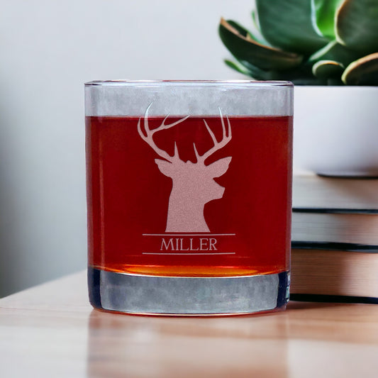 Deer Stag Head Engraved 11oz Whiskey Glass - Buck Lowball Glass - Optional Free Personalization