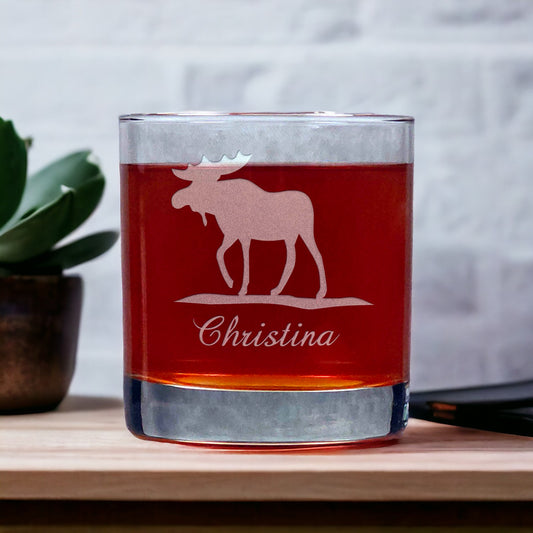 Moose Engraved 11oz Whiskey Glass - Design 2 - Deeply Etched Personalized Gift