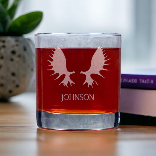 Moose Antlers Engraved 11oz Whiskey Glass - Deeply Etched Rocks Glass
