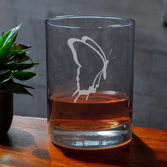 Engraved Butterfly 13oz Whiskey Glass, Gift for Mom, Grandma, or Aunt, Deeply Etched Rocks Glass