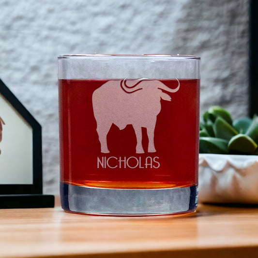 Bull Etched 11oz Whiskey Glass - Deeply Etched Rocks Glass