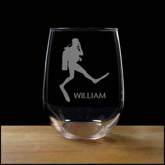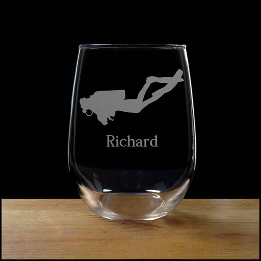 Scuba Diver 17oz Stemless Wine Glass - Deeply Etched Personalized Gift
