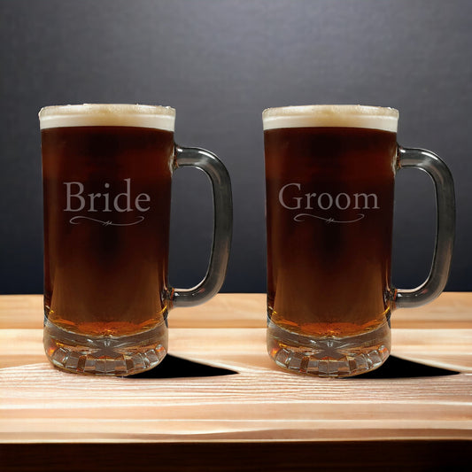 Deeply Etched 16oz Beer Mug for the Bride and Groom - Set of 2 - Wedding Personalized Gift