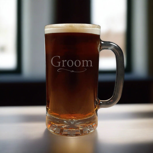 Groom 16oz Engraved Beer Mug - Groom underlined with a scroll - Wedding Personalized Gift