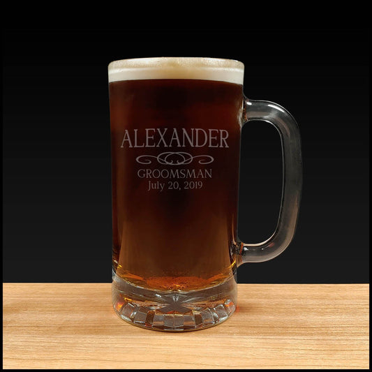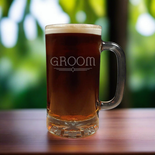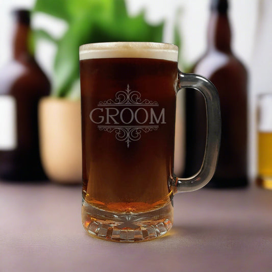 Groom 16oz Engraved Beer Mug with Classical Design - Wedding Personalized Gift