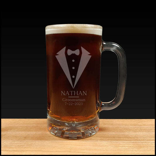 Groomsman Tuxedo Design 16oz Engraved Beer Mug - Wedding Party Personalized Gift