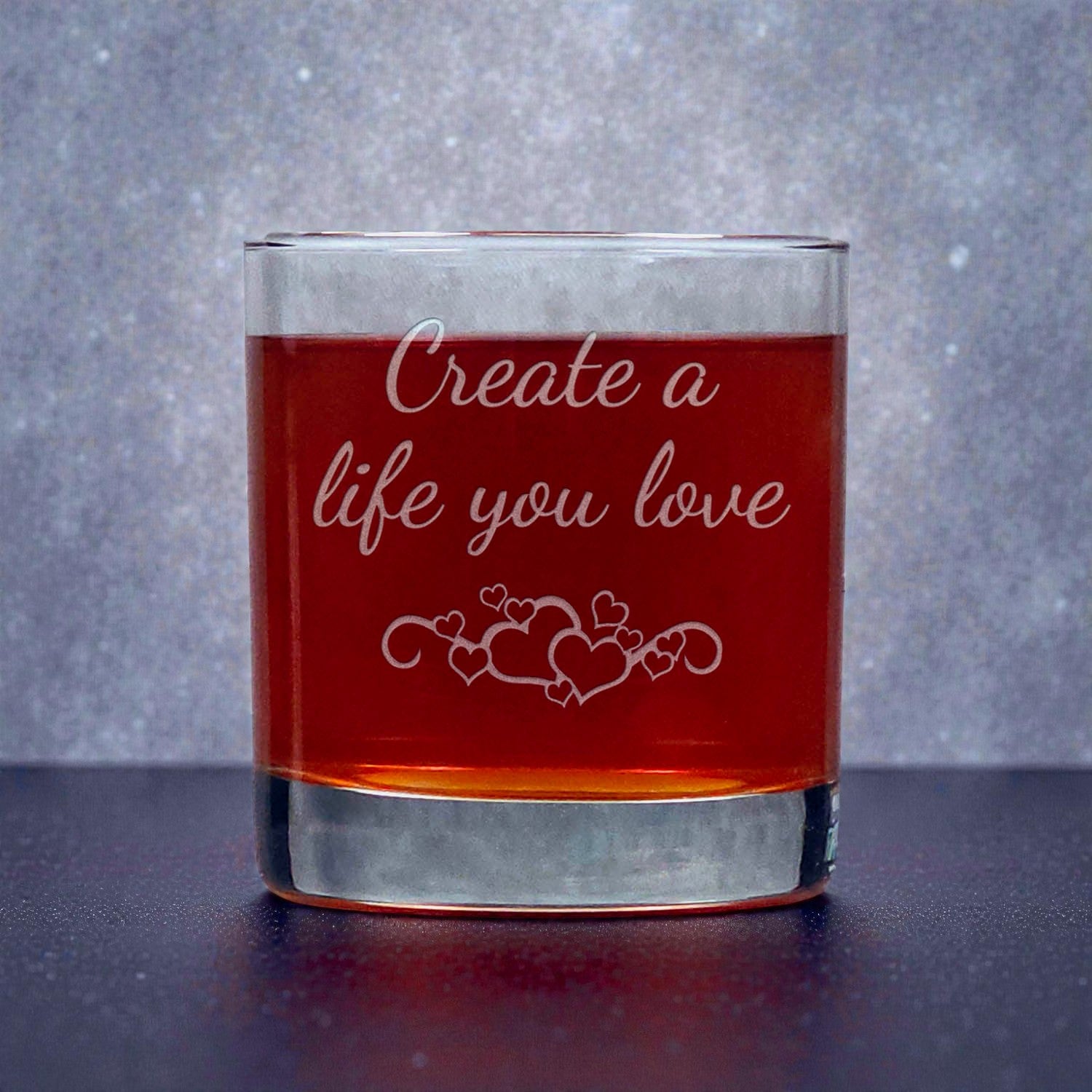 - 11oz whiskey glass engraved with the inspirational quote: "Create the life you love"