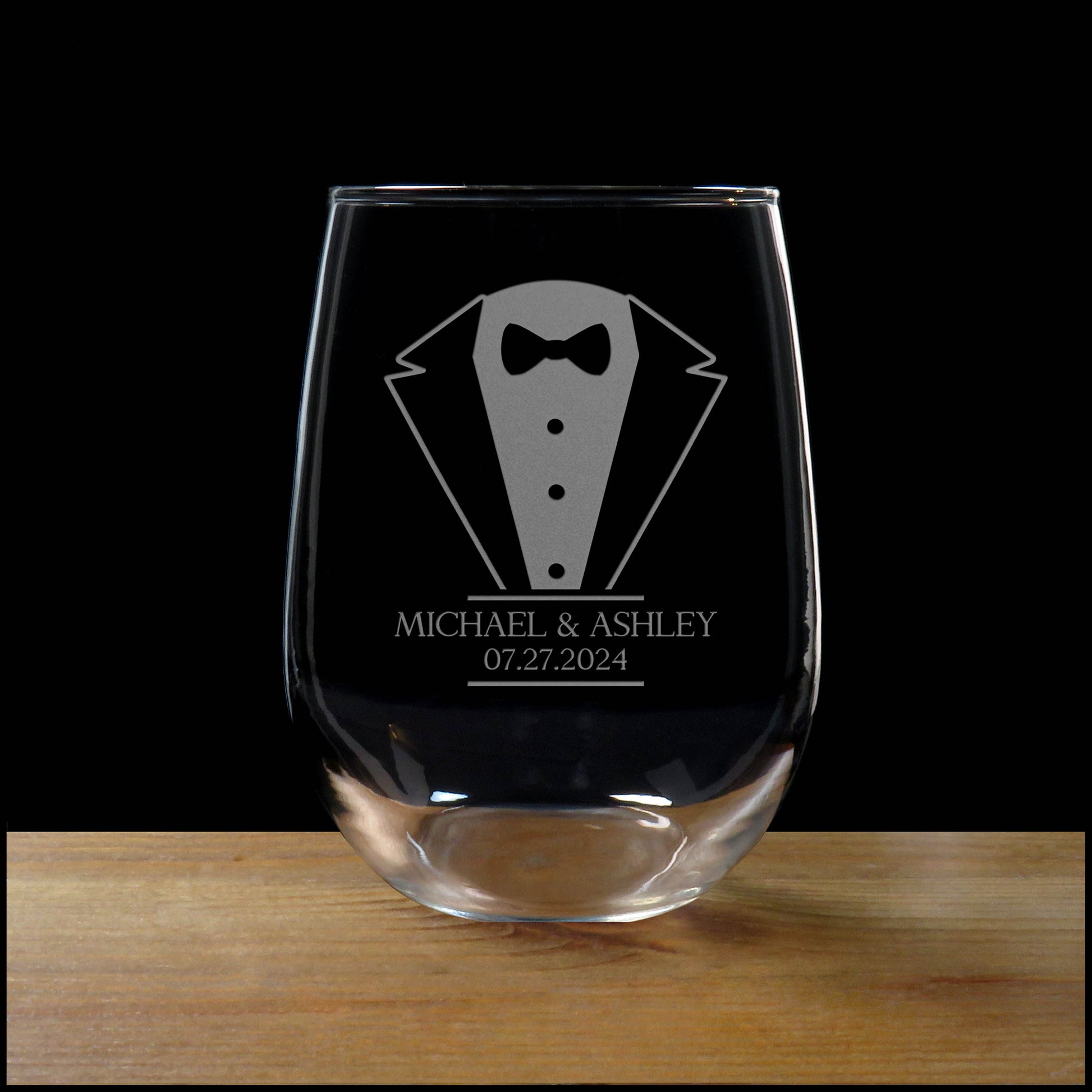These beautiful 17oz stemless wine glasses are the perfect personalized gift for the the Bride and Groom. Deeply sandblasted with care, they will be a cherished memento for the happy couple for years to come. They will remember the happy occasion of their wedding day every time they drink their wine from their special glasses.